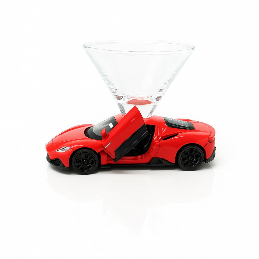 This Maserati MC20 Martini Glass pairs a classic car with a crystal-clear Martini Taster Glass (approx. 3.5" wide x 2.5" tall) to create a show-stopping piece for your home bar or display shelf. The diecast metal, finished in Cotton Candy Pink, features exquisite details - from chrome bumpers to wire-spoke wheels - bringing authentic automotive elegance to your cocktail experience.